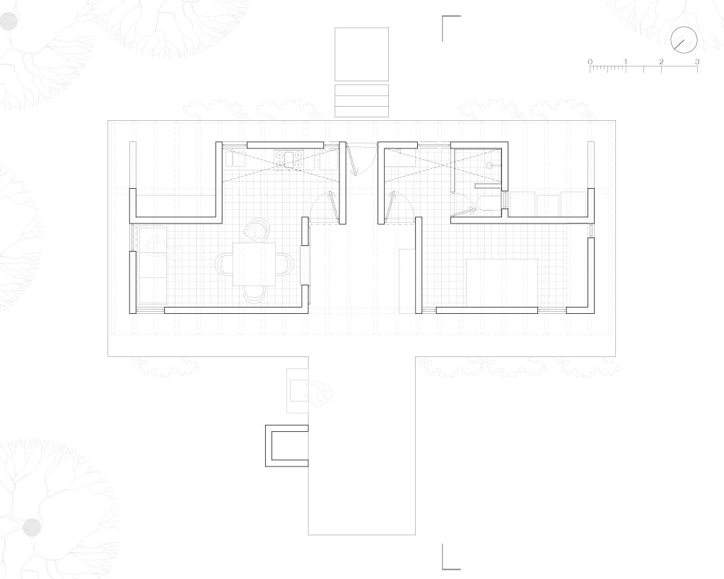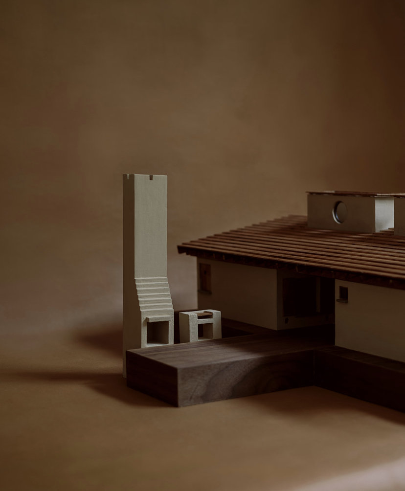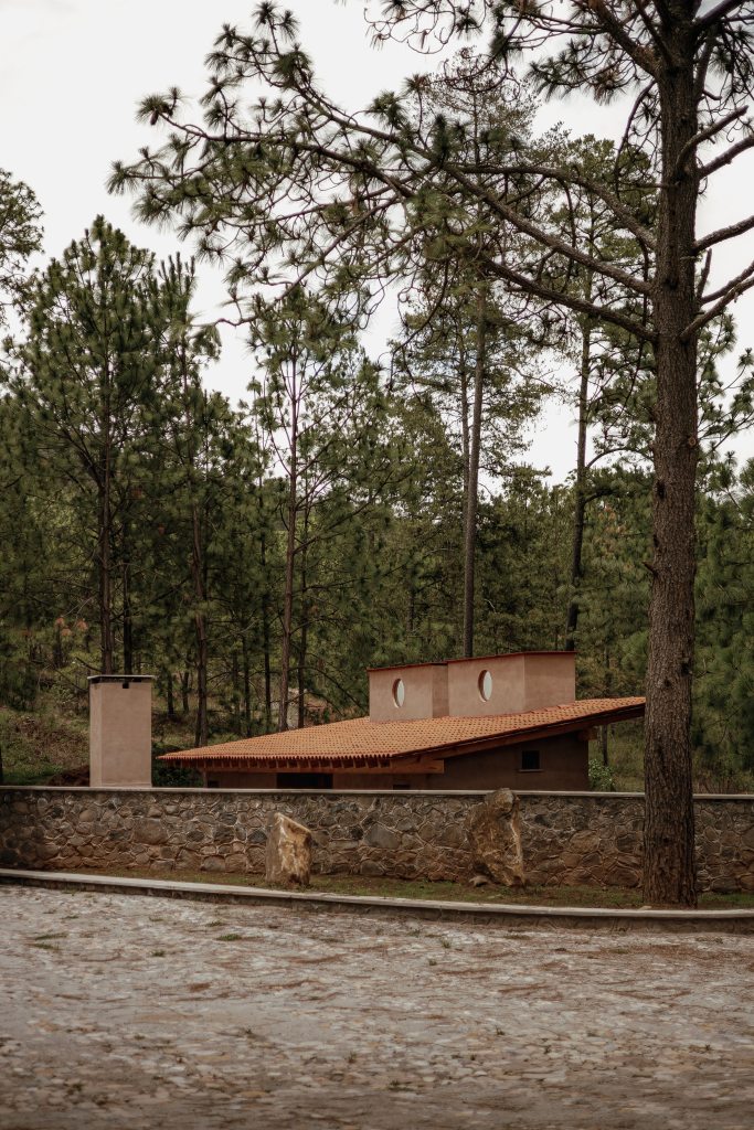 En menos de 80 m2 se desarrolla este espacio habitacional que cubre las necesidades básicas del velador, quien funge como primer contacto al ingresar al predio y como integrante fundamental en el proceso de desarrollo del proyecto de gran escala previsto para el resto del polígono. Dos volúmenes, concebidos como células espejadas, albergan en su interior un programa arquitectónico que va desde áreas privadas hasta espacios de convivencia. La volumetría, intersectada por una única cubierta, genera un zaguán semiexterior que, conectado a través de una plataforma de piedra con el área de asador, da vida a esta caseta.